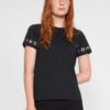 Het model op de foto is 172 en draagt maat S. De top valt op maat.